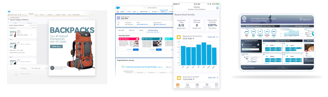 Marketing Cloud -ratkaisun avulla voit luoda henkilökohtaisia suhteita kaikissa kanavissa ja liikkumismuodoissa: sähköpostit, verkko, sosiaaliset verkostot, yhdistetyt objektit... Järjestä, seuraa kampanjoitasi ja hyödynnä kaikkea asiakkaiden kanssa vuorovaikutuksessa kerättyä dataa tarjotaksesi heille kohdistetumpaa sisältöä. räätälöityjä ja heidän tarpeidensa mukaisia.